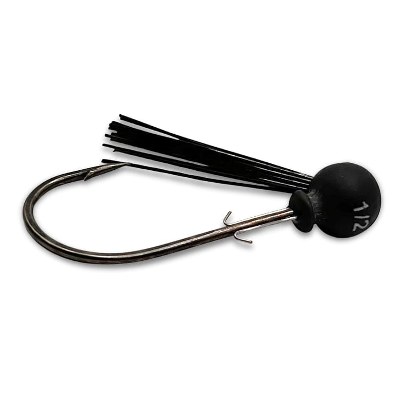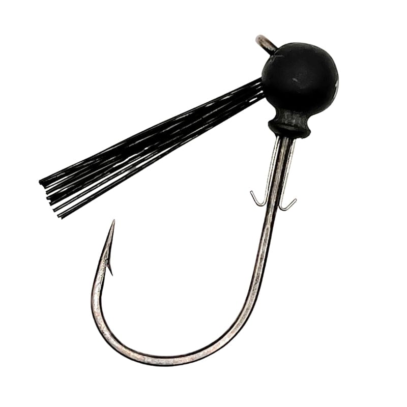 Round style jig with a recessed hook eye, double wire keeper, custom medium gauge weedguard, and a size printed on every head.